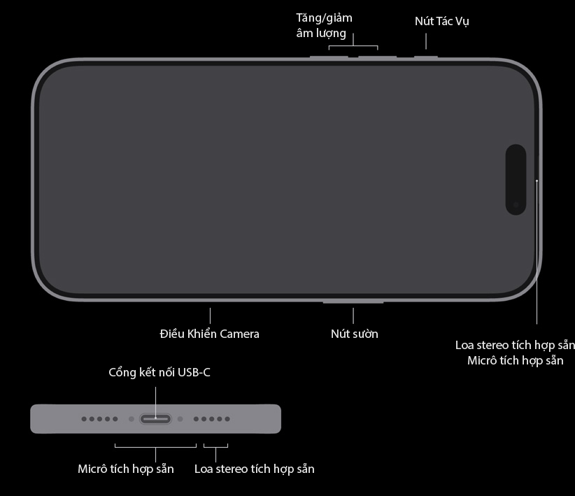 Nút Tác Vụ. Nhanh chóng đến tính năng yêu thích của bạn theo cách có thể tùy chỉnh. Nhấn giữ để khởi chạy tác vụ bạn muốn – chế độ Im Lặng, Dịch Thuật, Phím Tắt và nhiều tác vụ khác.