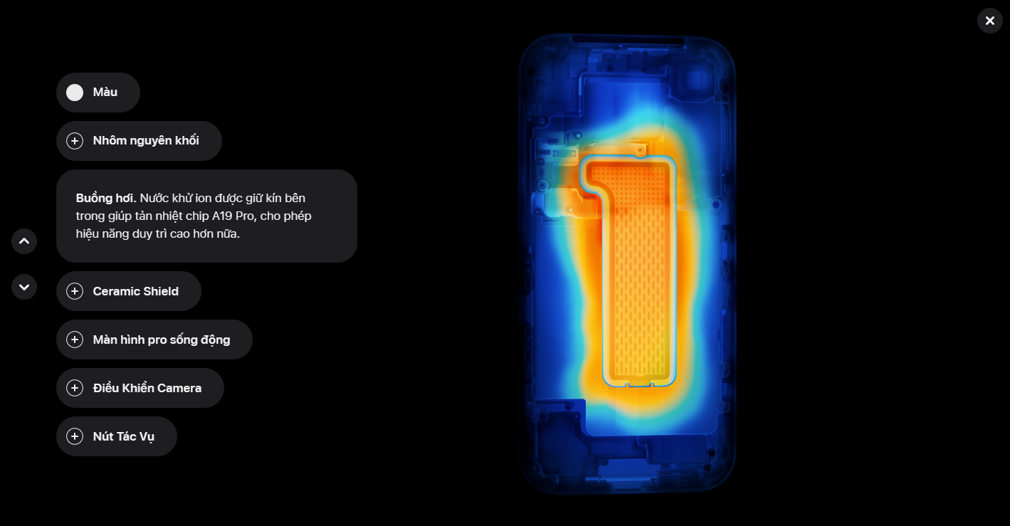 Buồng hơi. Nước khử ion được giữ kín bên trong giúp tản nhiệt chip A19 Pro, cho phép hiệu năng duy trì cao hơn nữa.