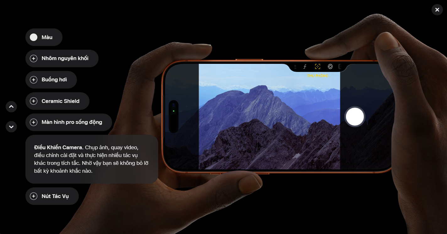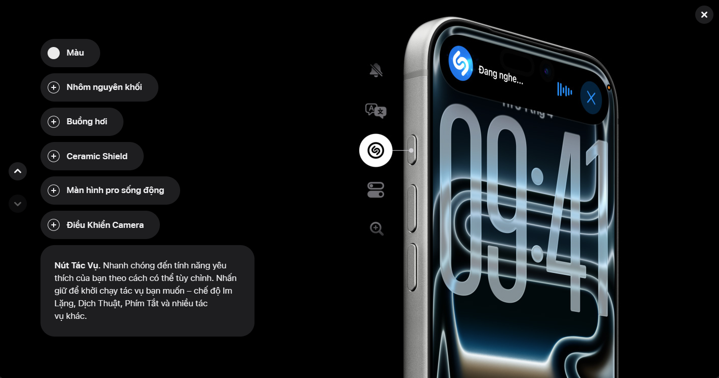 | | Tính năng của nút Tác Vụ Chế độ Im Lặng, Tập Trung, Camera, Trí Thông Minh Thị Giác, Đèn Pin, Ghi Âm, Nhận Dạng Nhạc, Dịch Thuật, Kính Lúp, Điều Khiển, Phím Tắt hoặc Trợ Năng Các công cụ điều khiển camera Độ Phơi Sáng, Chiều Sâu, Thu Phóng, Camera, Phong Cách, Tông |